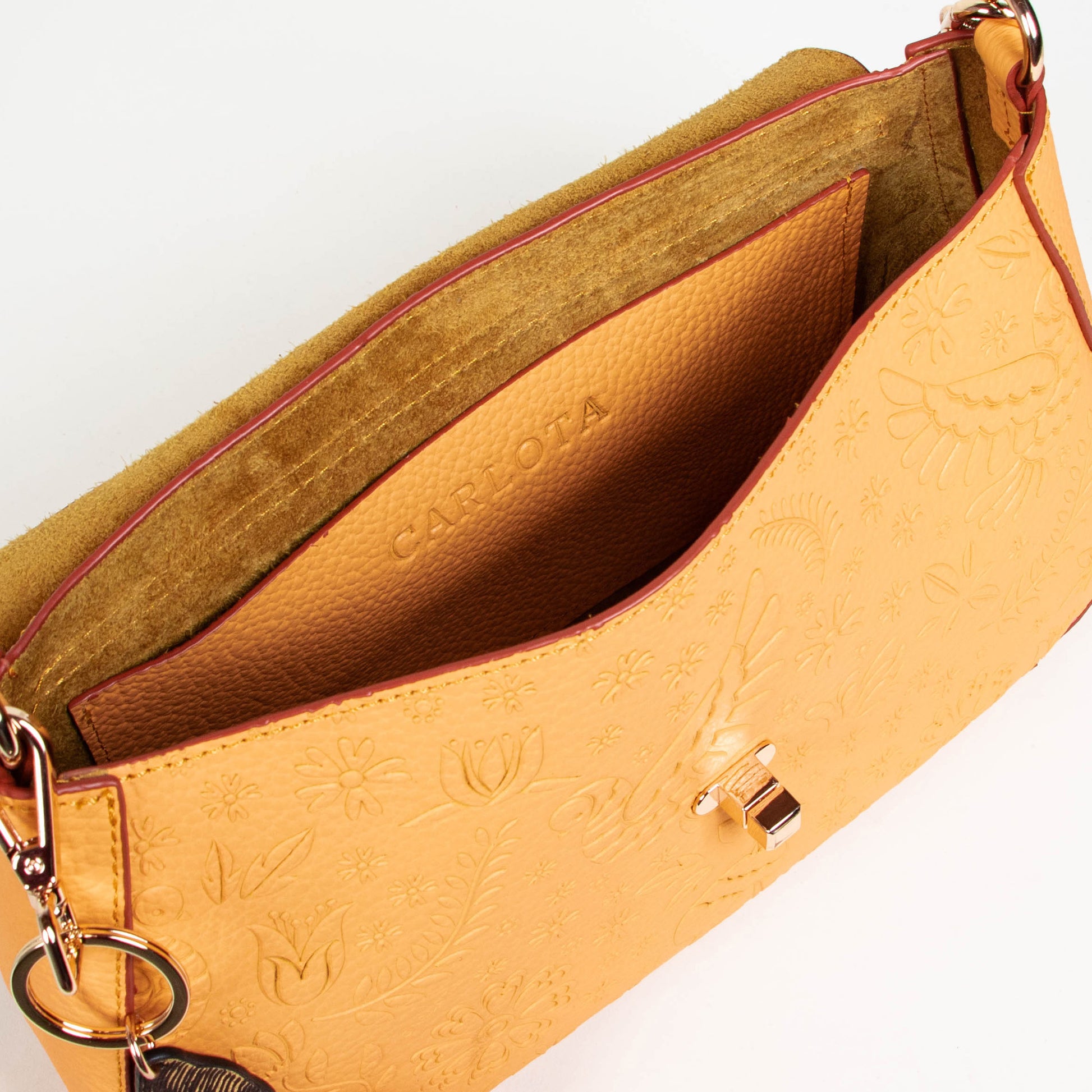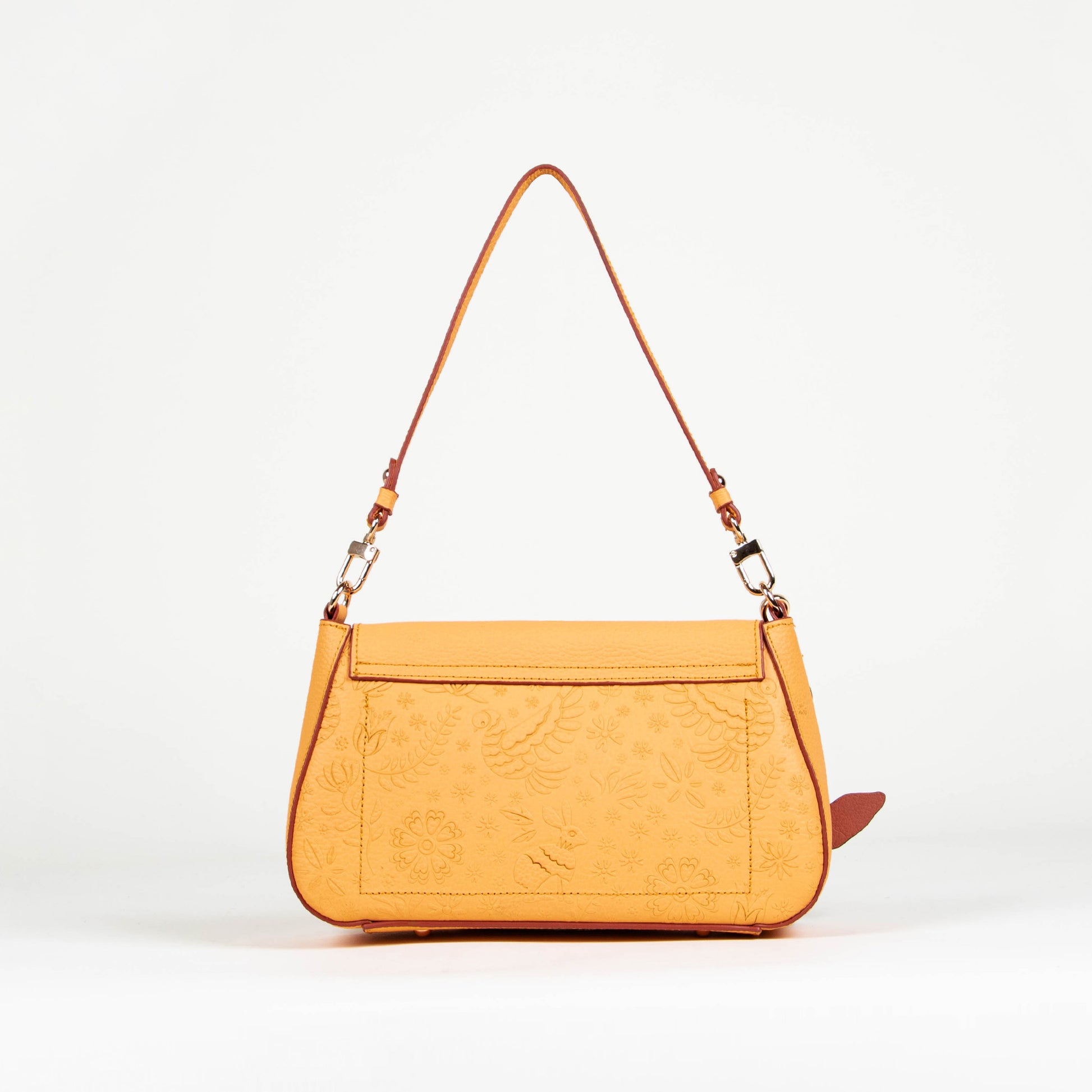 Conoce nuestro bolso baguette edición especial con delicados bordes en tono rojo, el equilibrio perfecto entre elegancia y estilo. Con una textura de relieve única, inspirada en la leyenda de la liebre y la luna, este bolso refleja sofisticación en cada detalle. Su tamaño ideal lo convierte en el accesorio perfecto para llevar lo esencial de forma organizada y con estilo. El asa al hombro asegura comodidad durante su día, mientras sus hermosos herrajes dorados añaden un toque de lujo y distinción. El bolso ideal para quienes buscan un accesorio atemporal lleno de carácter y elegancia.