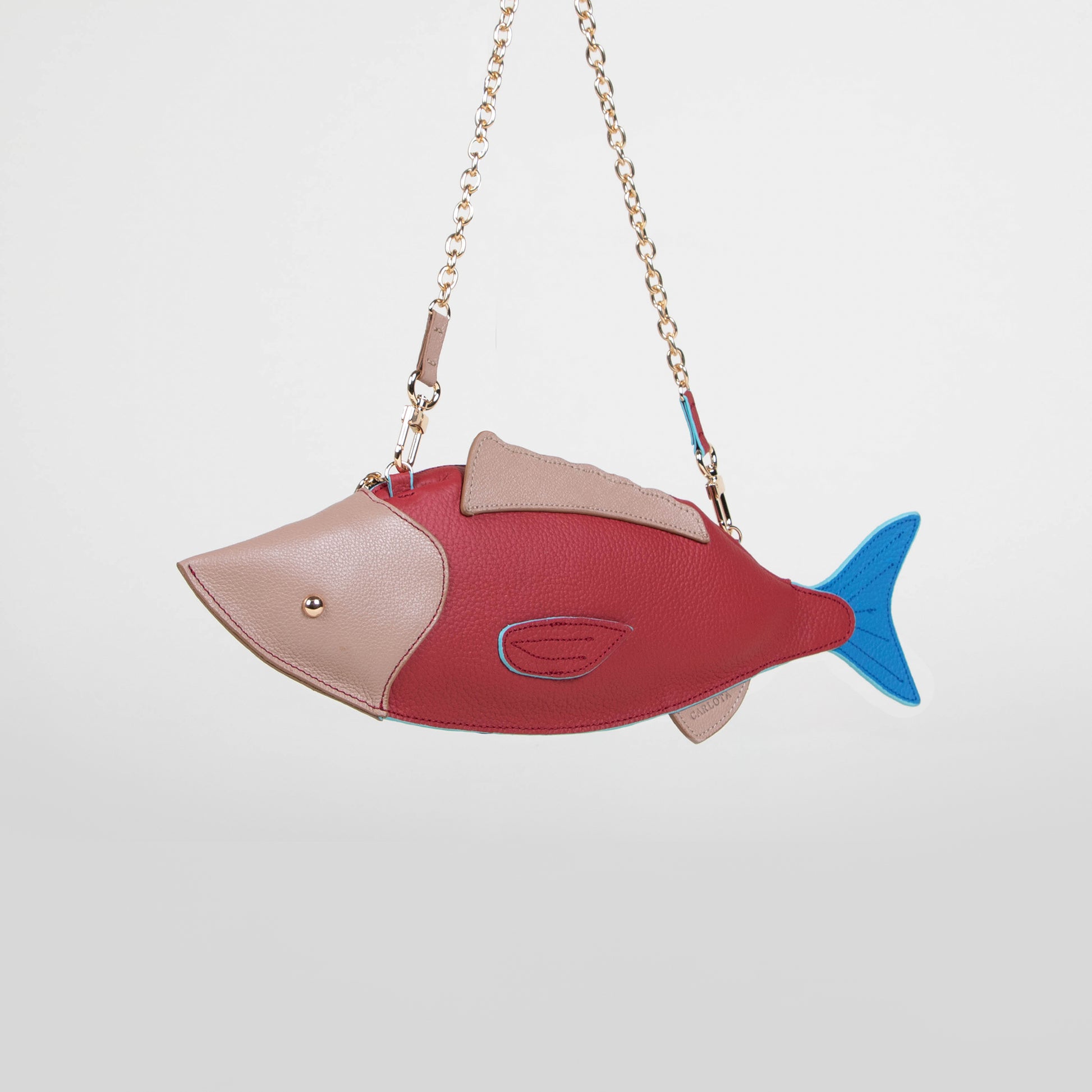 Crossbody pescado. Trayendo un bolso en forma del pescado de la carta de la lotería.