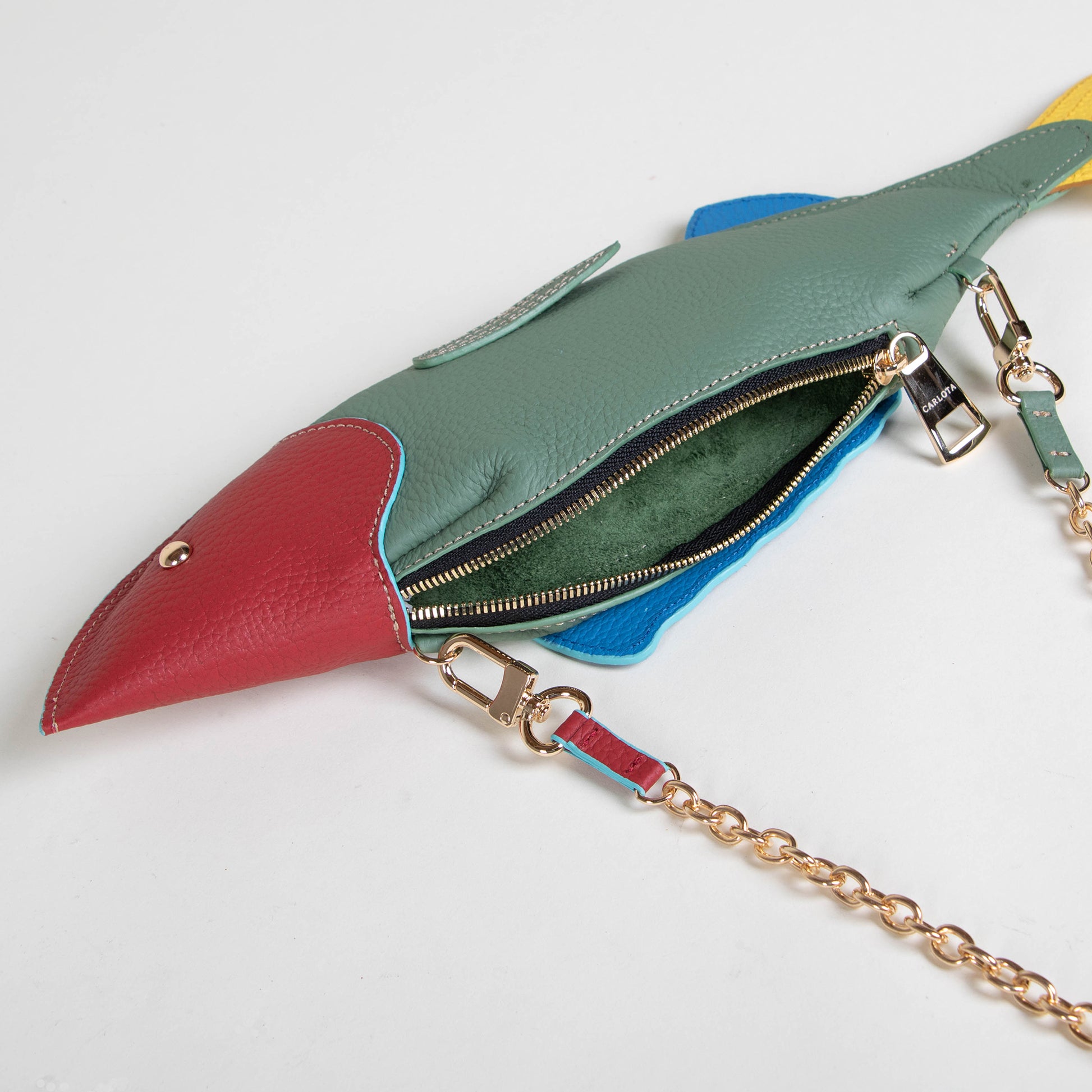 Crossbody pescado. Trayendo un bolso en forma del pescado de la carta de la lotería.