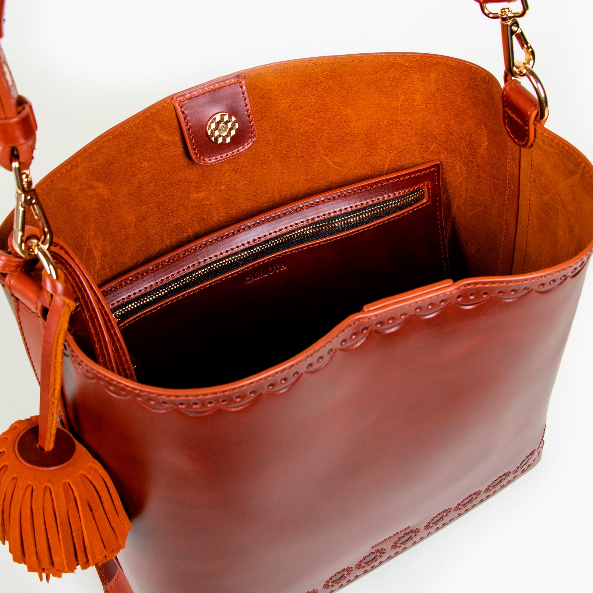 Una nueva versión de nuestro bolso Hobo en un diseño inspirado en la colección de Maceta, con un grabado sutil y un charm en terciopelo que nos recuerda a la flora de México.