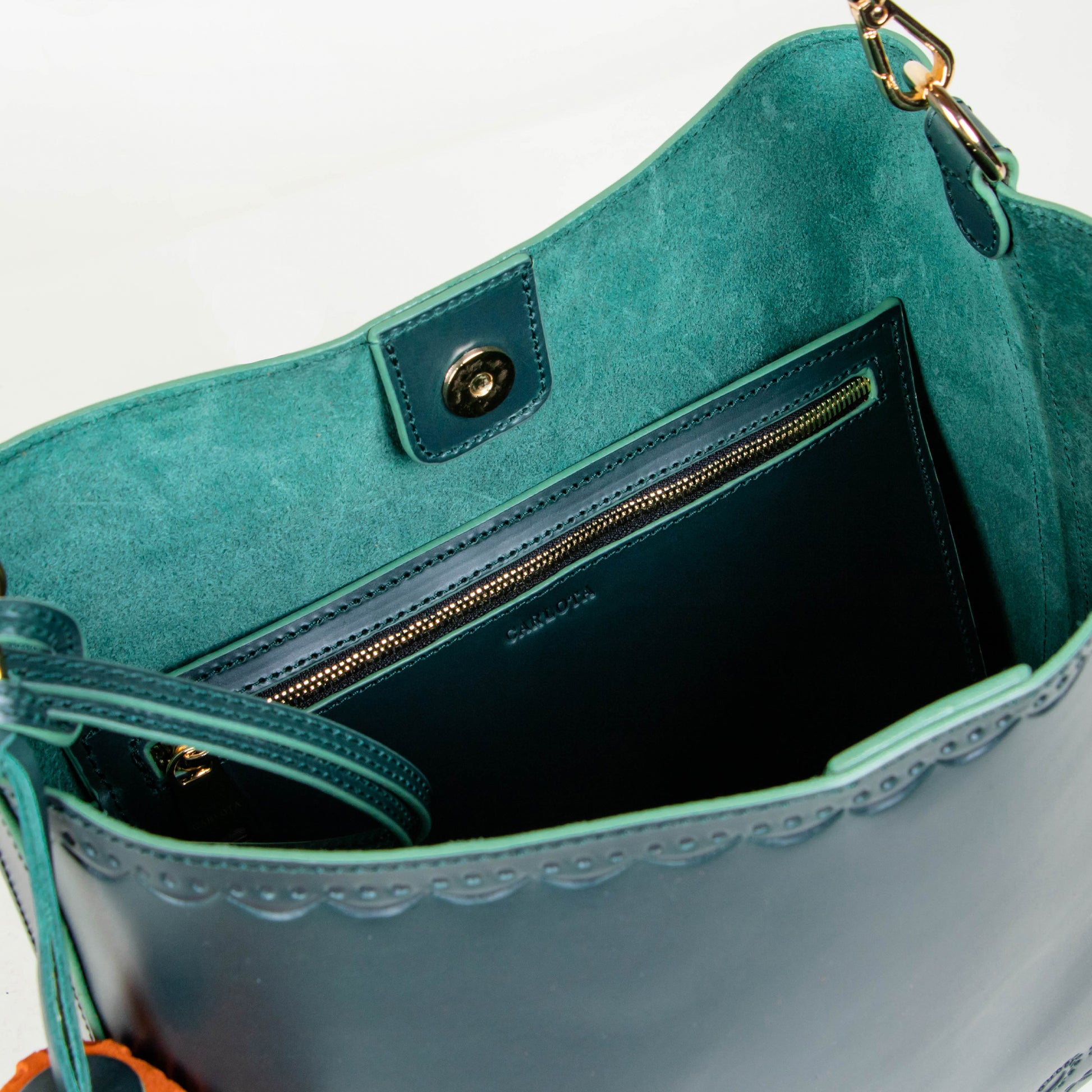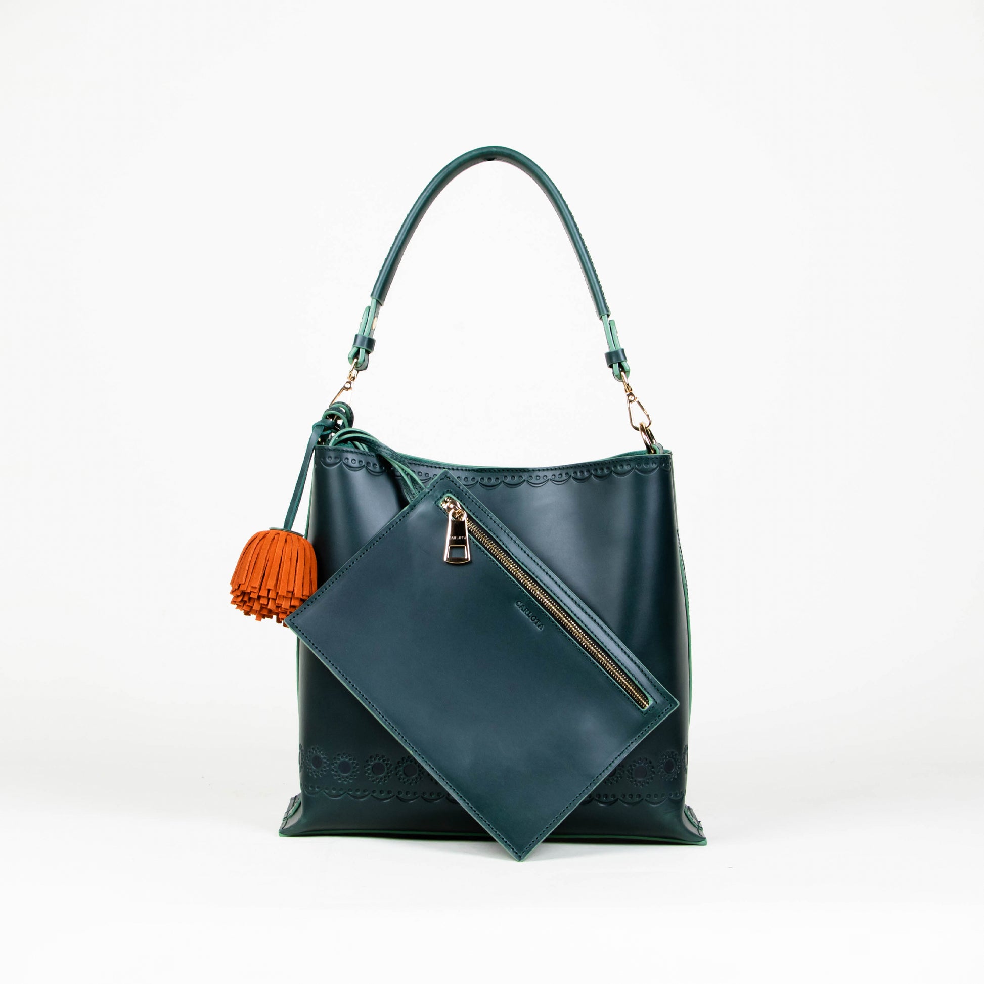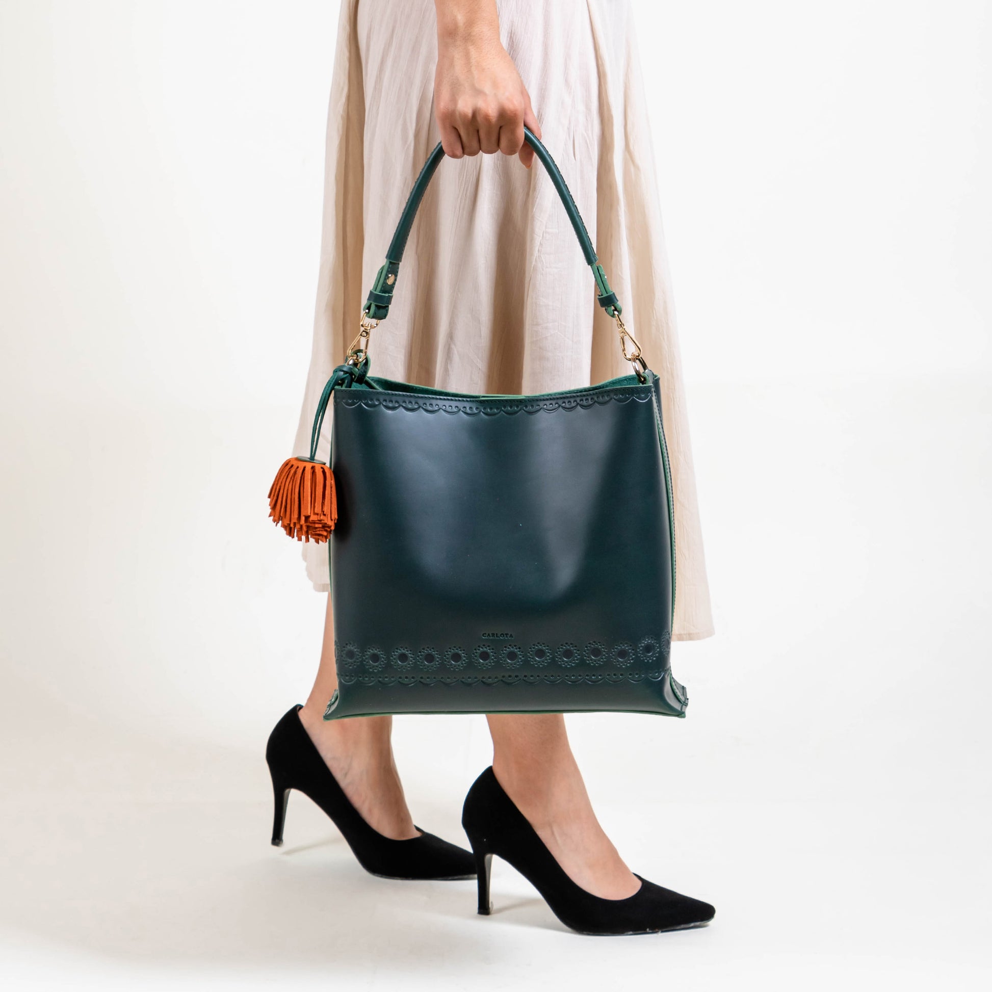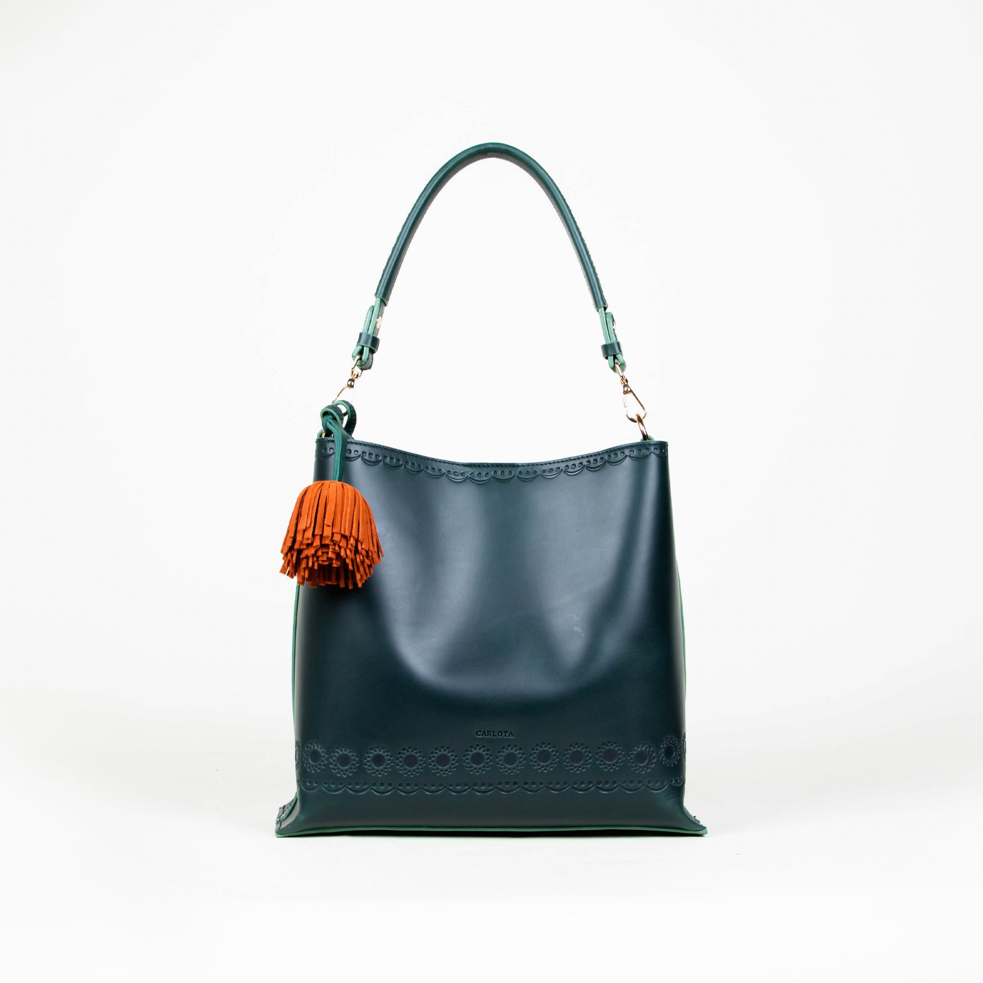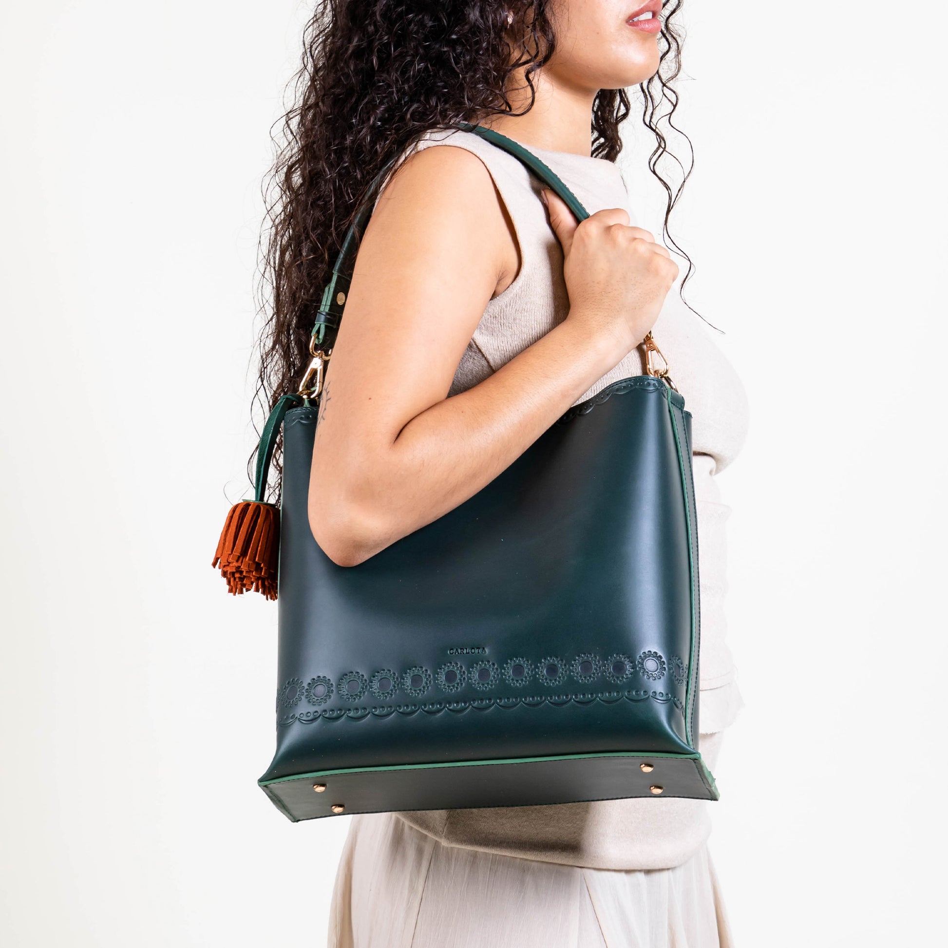 Una nueva versión de nuestro bolso Hobo en un diseño inspirado en la colección de Maceta, con un grabado sutil y un charm en terciopelo que nos recuerda a la flora de México.