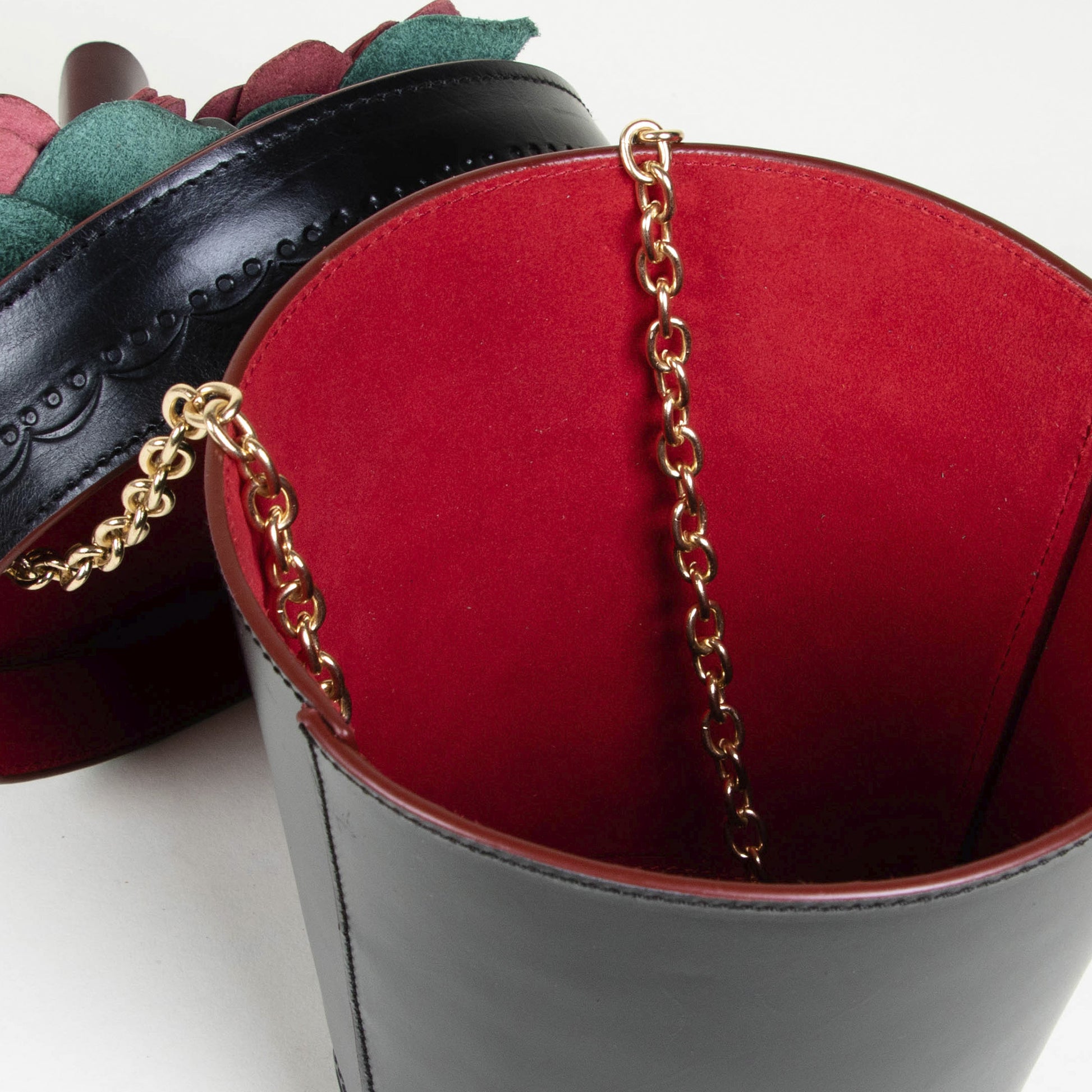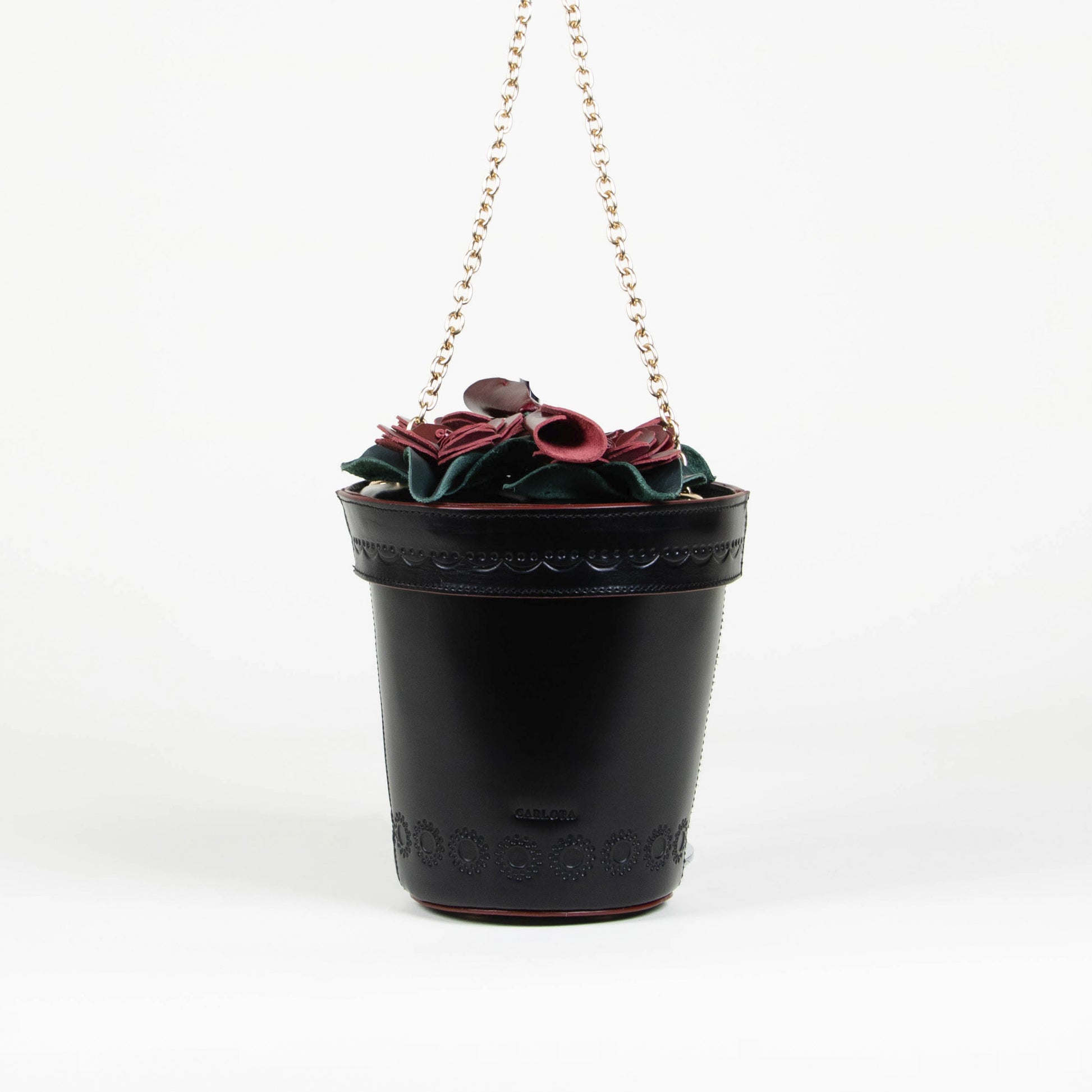 Hecha totalmente de piel con de talles de grabado hechos a mano y una cadena larga para usarse como crossbody.