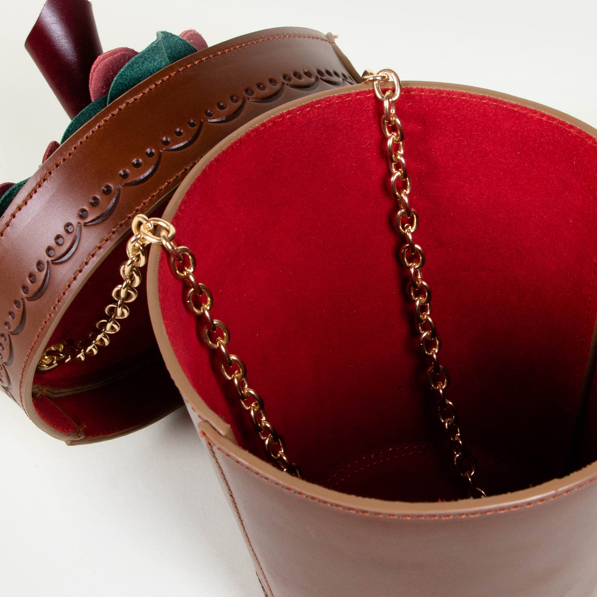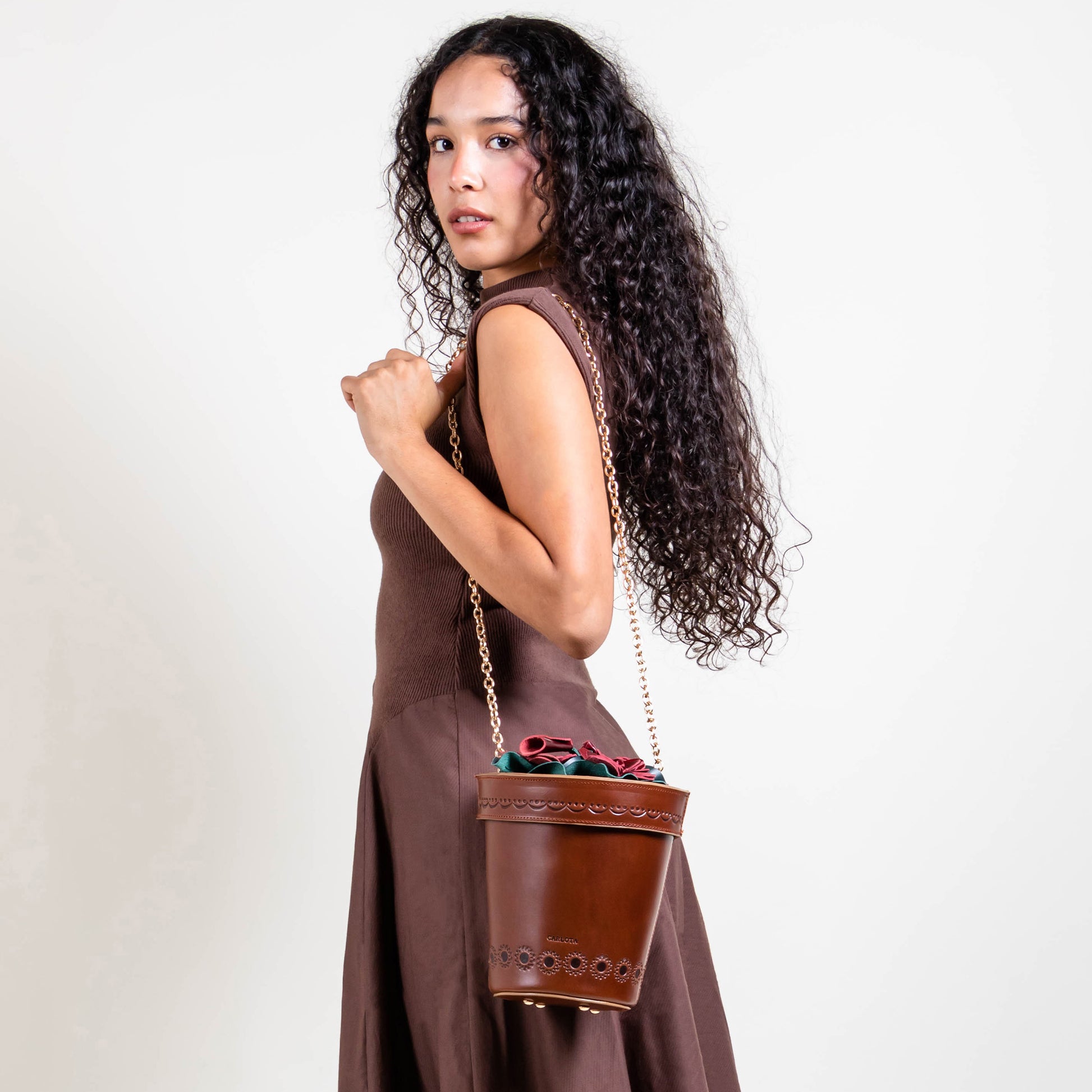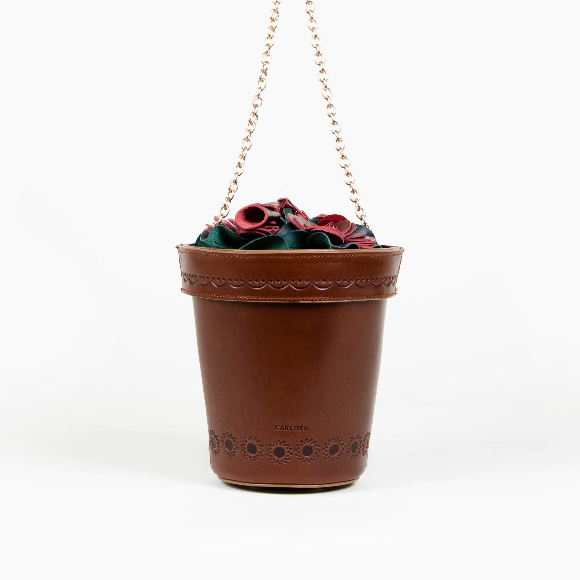 Hecha totalmente de piel con de talles de grabado hechos a mano y una cadena larga para usarse como crossbody.