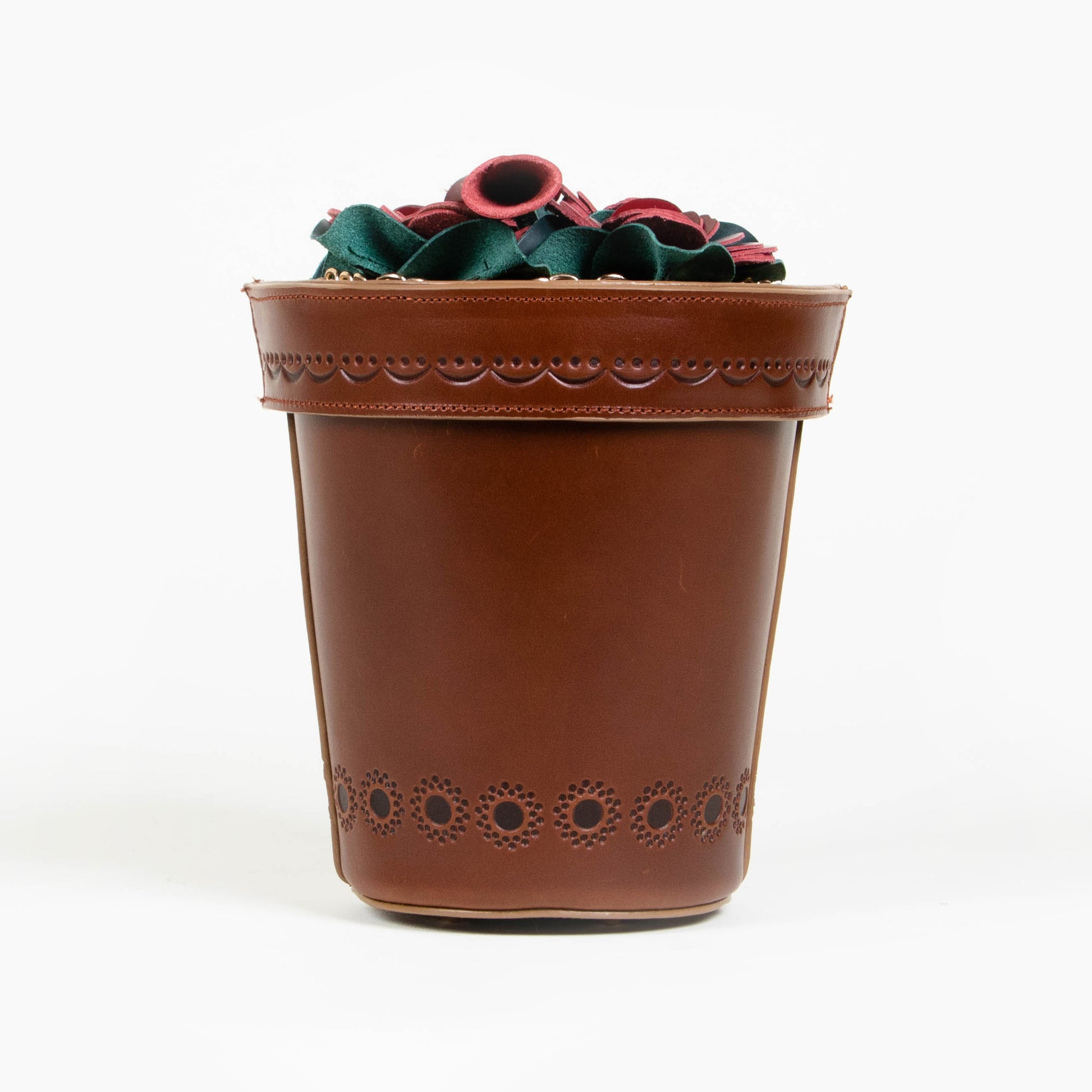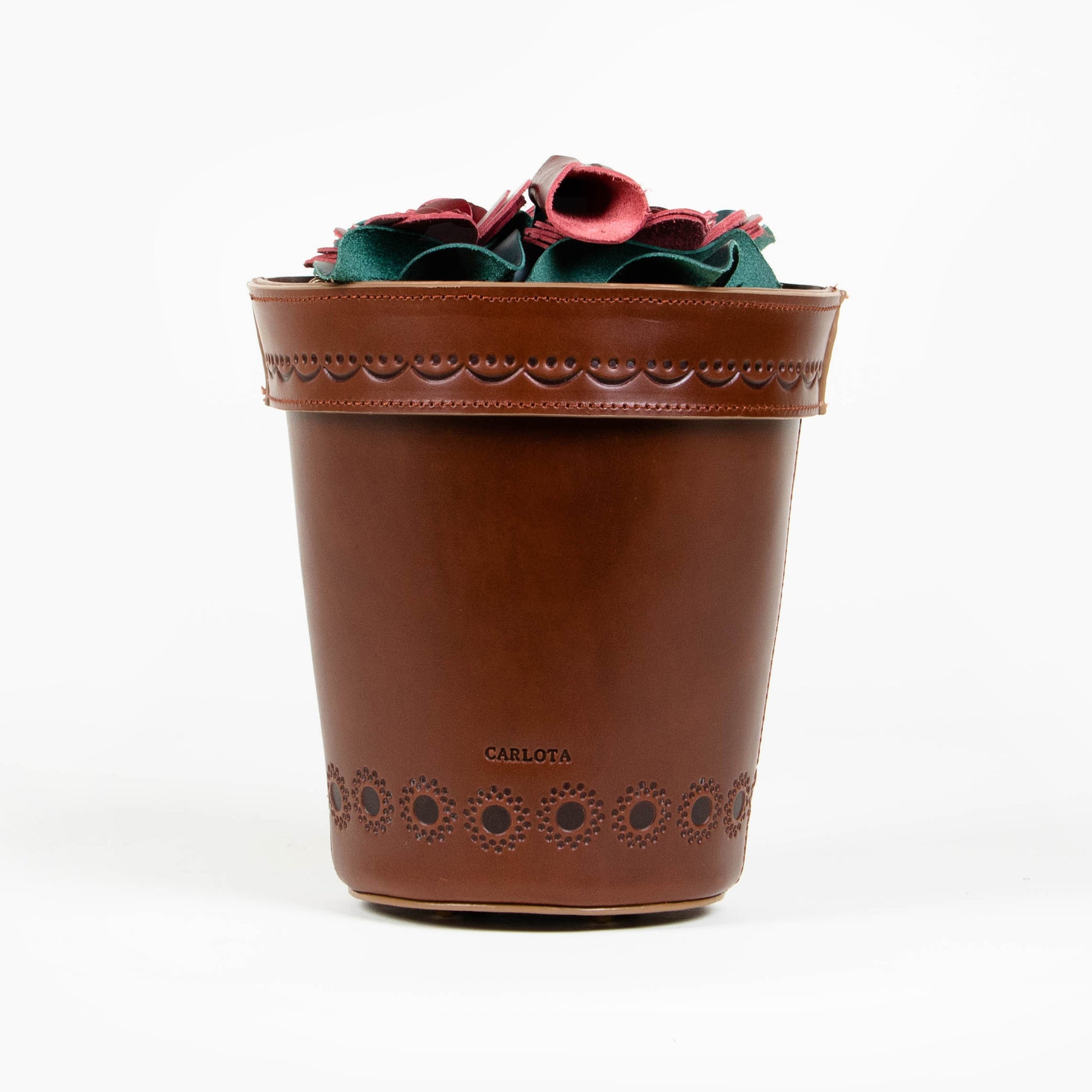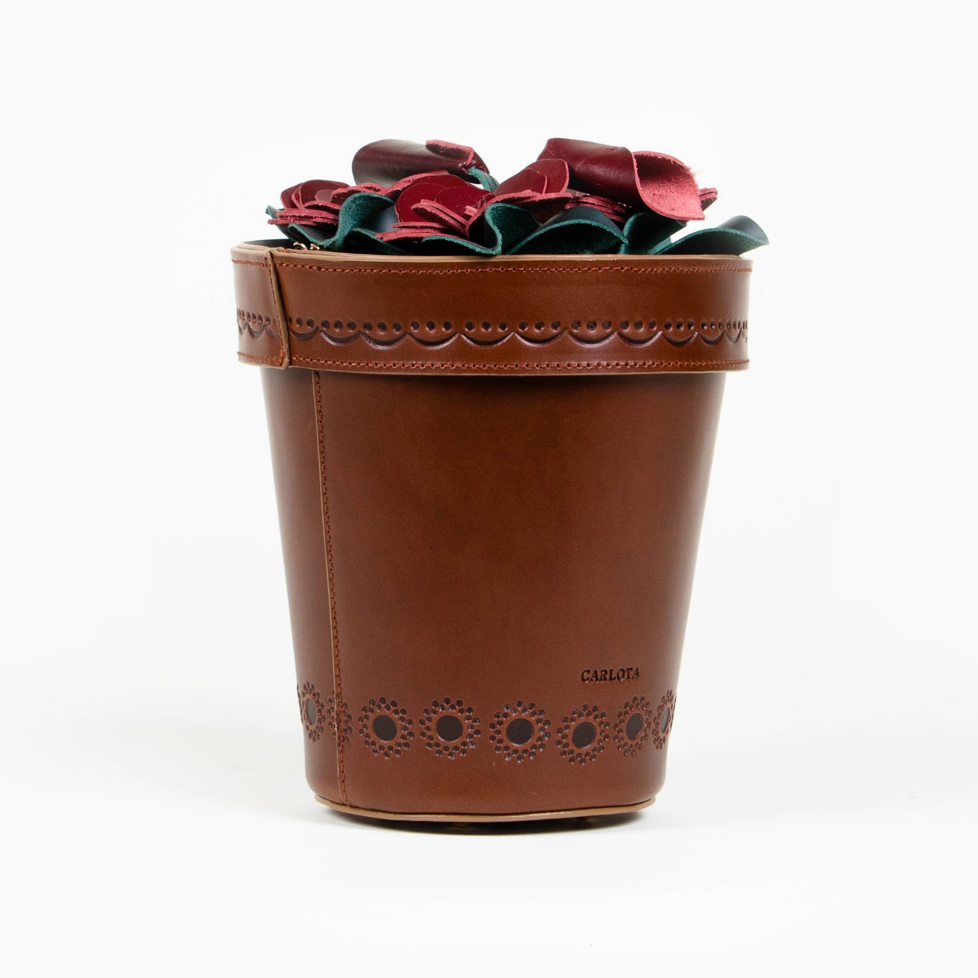 Hecha totalmente de piel con de talles de grabado hechos a mano y una cadena larga para usarse como crossbody.