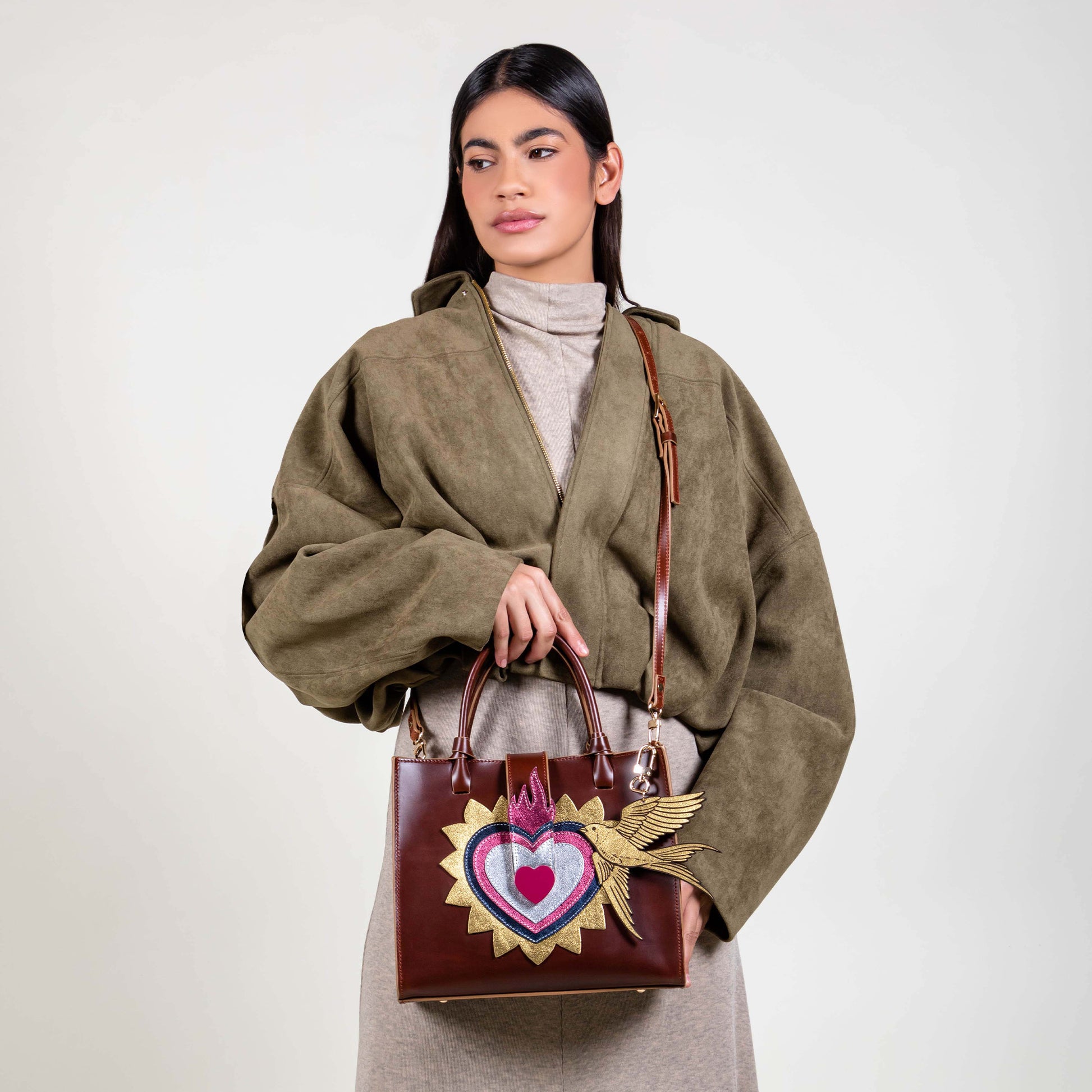 Nuestro clásico tote de doble asa con un charm de pajarito en metálico y una lengüeta con broche de imán en el centro.