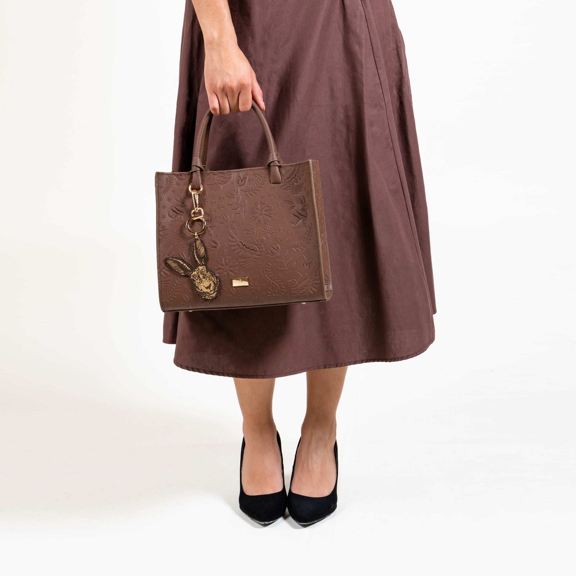 Te presentamos nuestra bolsa Mini Tote, un accesorio compacto pero lleno de estilo. Con un tamaño perfecto para tus complementos esenciales, esta bolsa cuenta con un bolsillo interno que asegura su organización y facilidad de uso. Su asa al hombro permite ser llevada a cualquier lugar y su asa removible te ofrece comodidad. Cuenta con un charm decorativo que brinda un toque único y especial, mientras sus elegantes herrajes dorados y textura de relieve enriquecen su diseño. Inspirado en la leyenda de la liebre, esta bolsa simboliza agilidad y elegancia en cada detalle.
